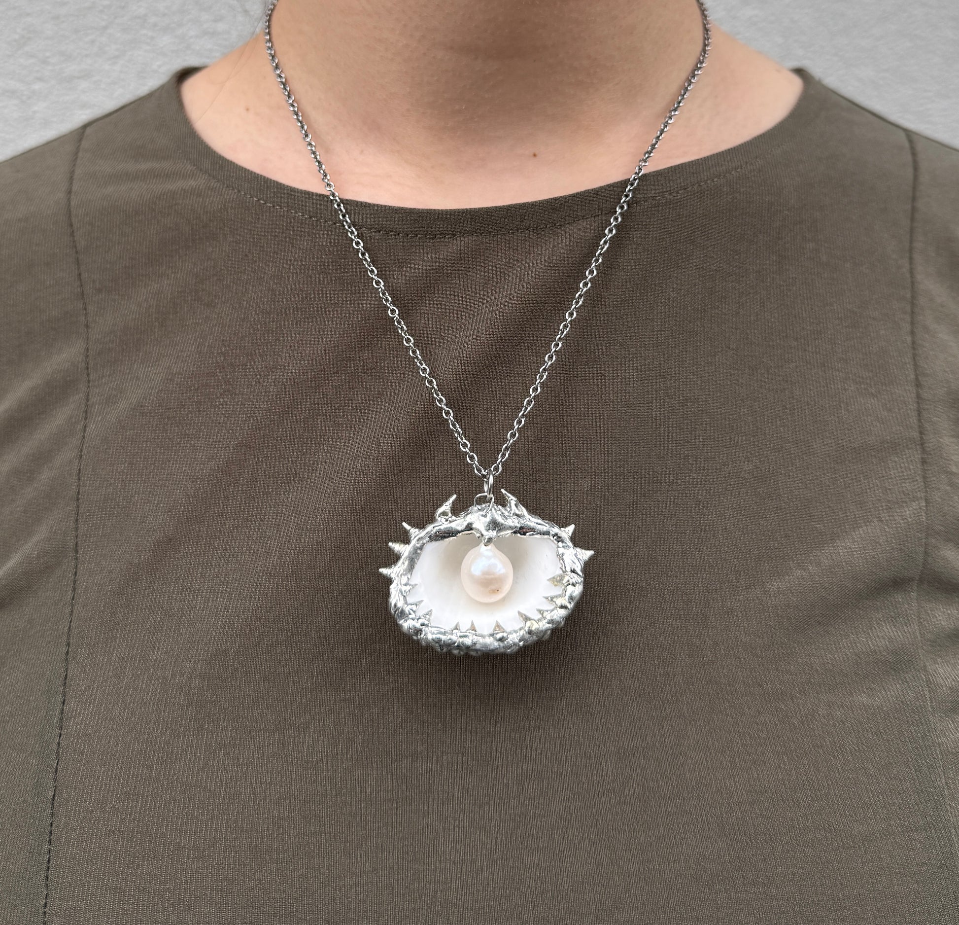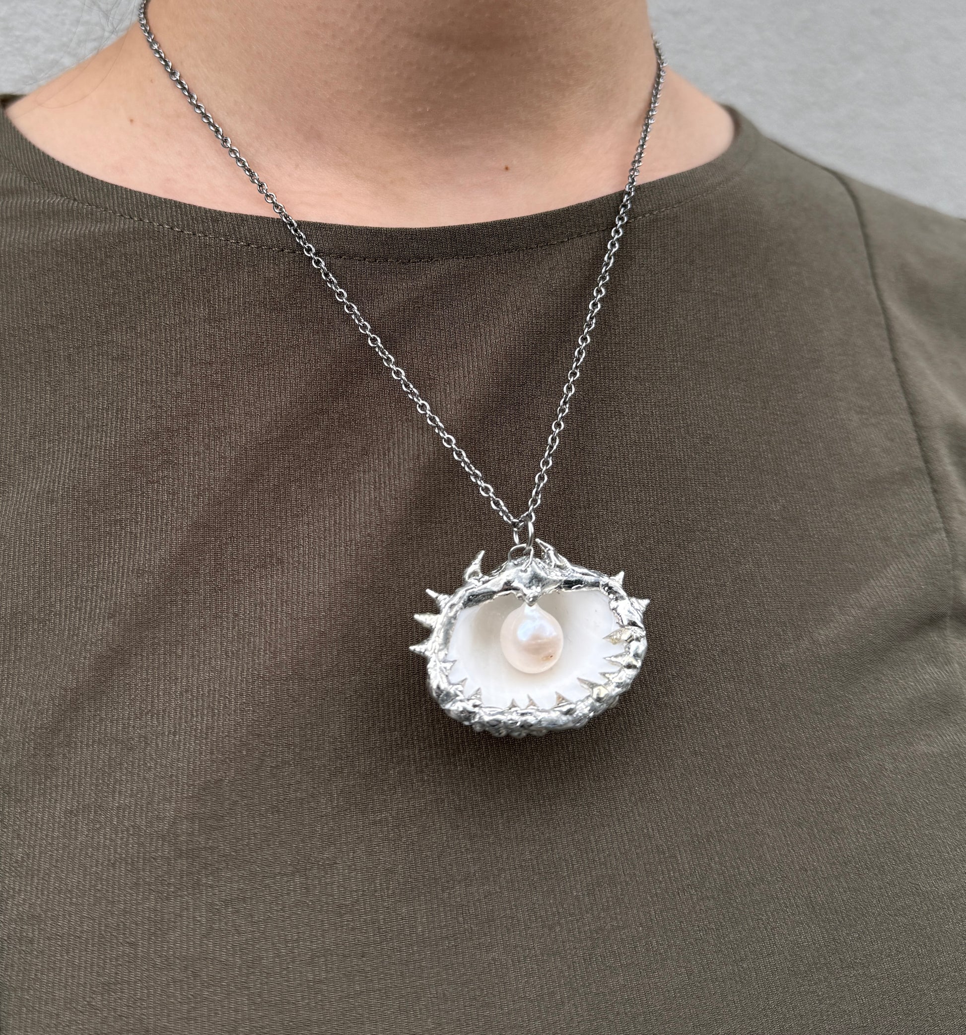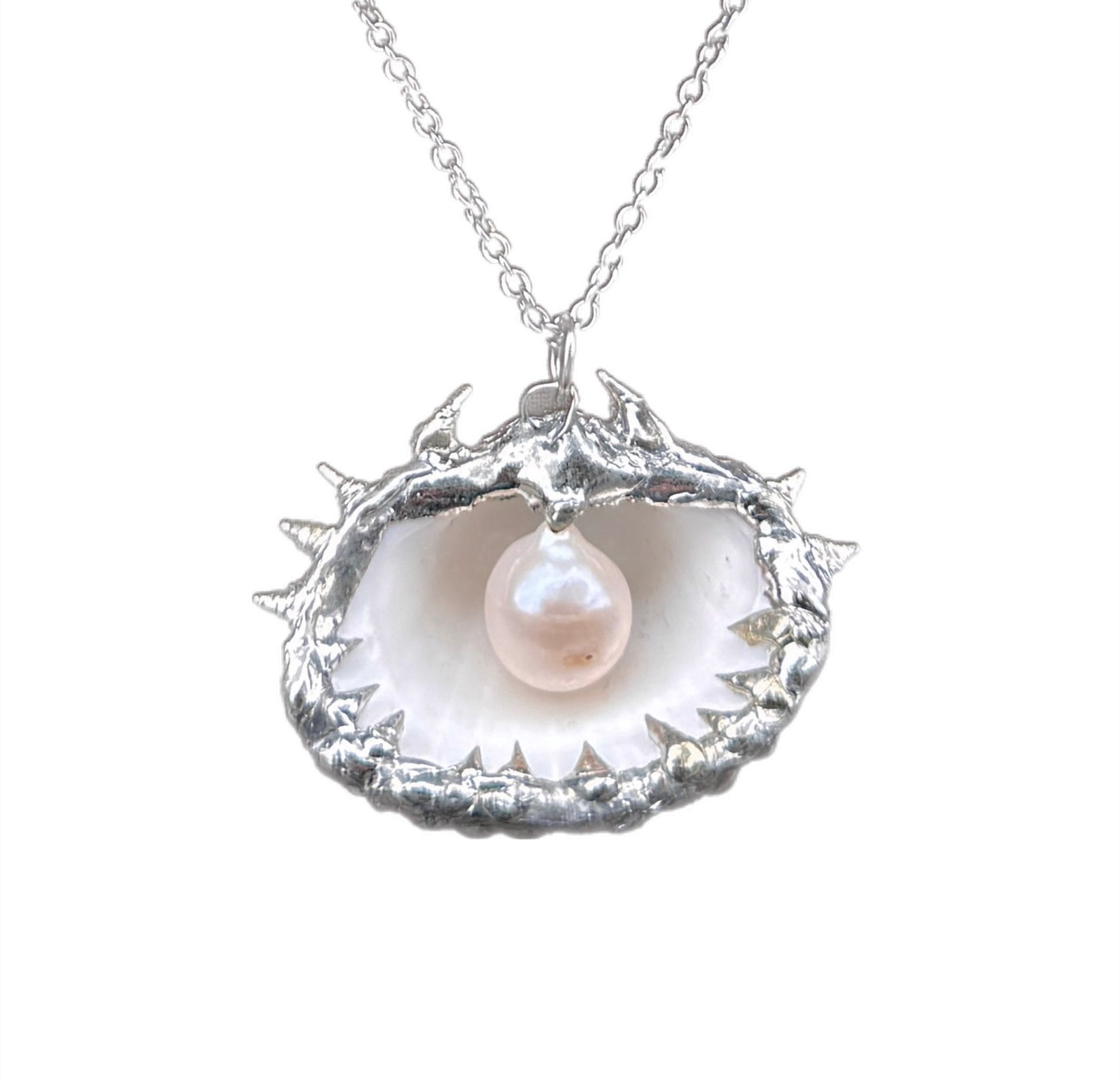 Handmade 1 of 1 soldered necklace featuring a spiky shell with a genuine freshwater pearl.
